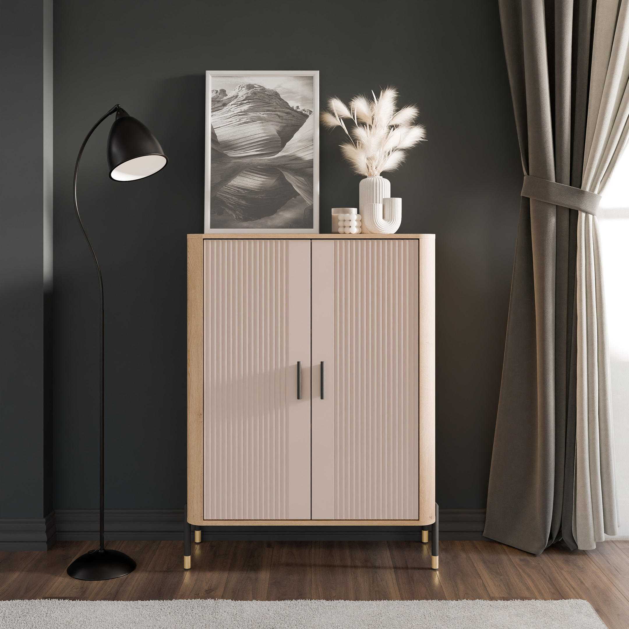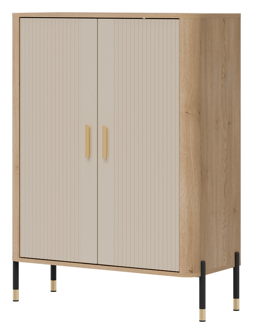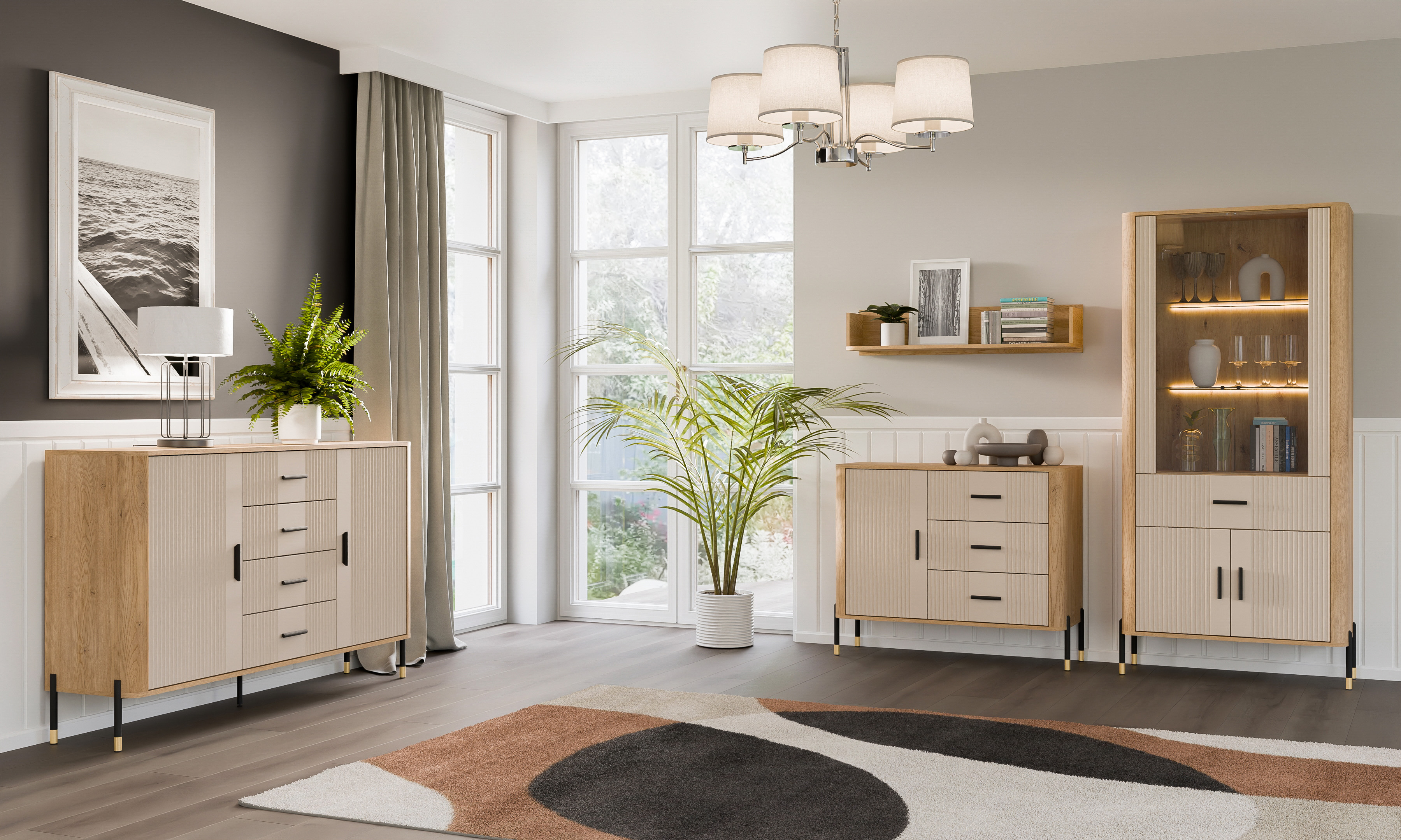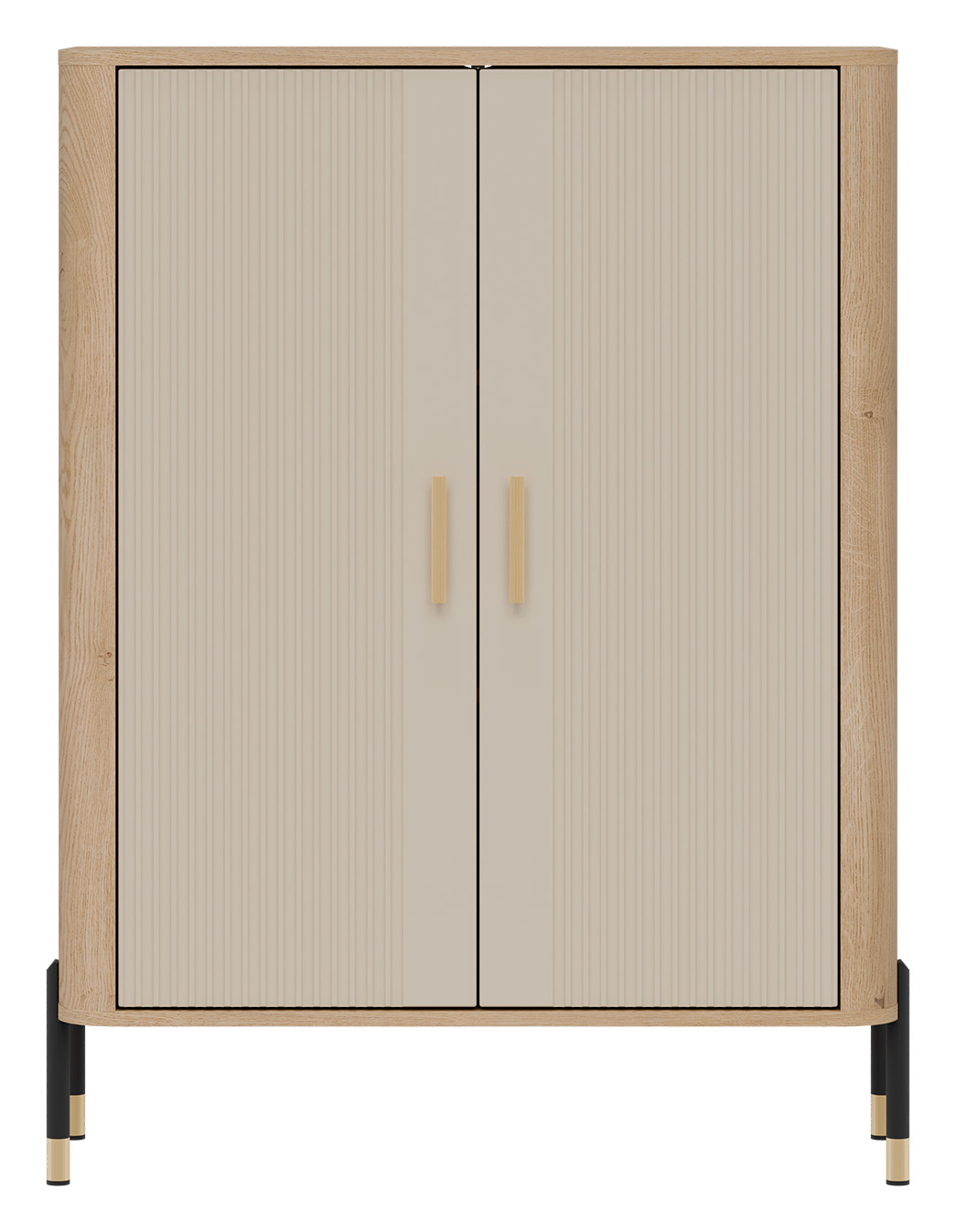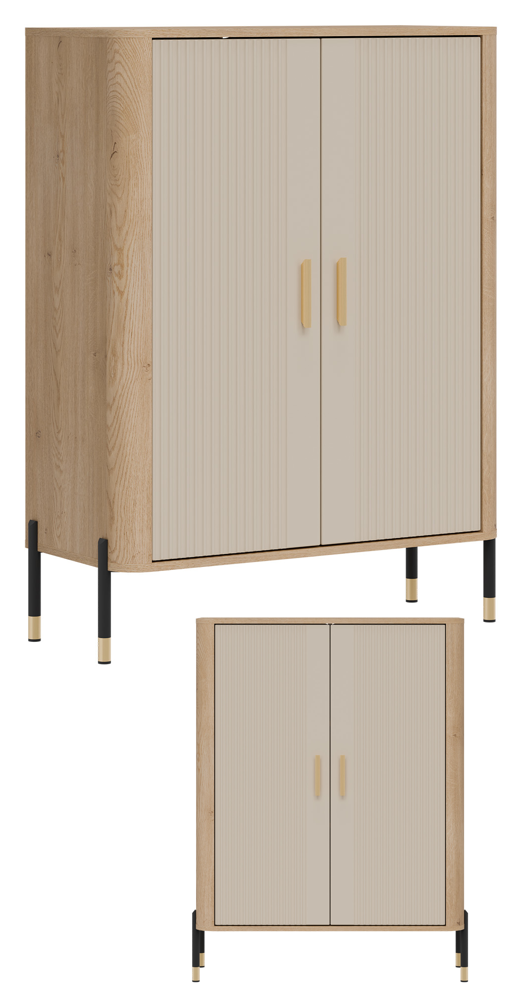 Szlachetne połączenie ryflowanych frontów w kaszmirowej kolorystyce o matowym wykończeniu z naturalnym dekorem dębu cremona torro nadaje meblowi elegancji i ponadczasowego stylu. Całość uzupełniają złote pionowe uchwyty i czarno-złote metalowe nogi, które dodają lekkości i nowoczesnego charakteru. Mimo zwartej formy, mebel emanuje solidnością oraz dbałością o detale.