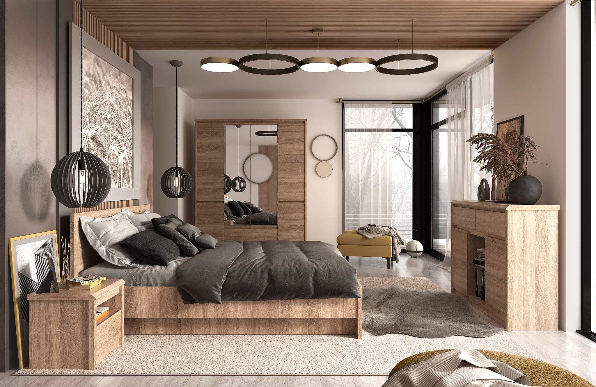 + Kolekcja jest w naturalnym odcieniu dąb sonoma, który został rozświetlony dodatkami w kolorze sosna canion.