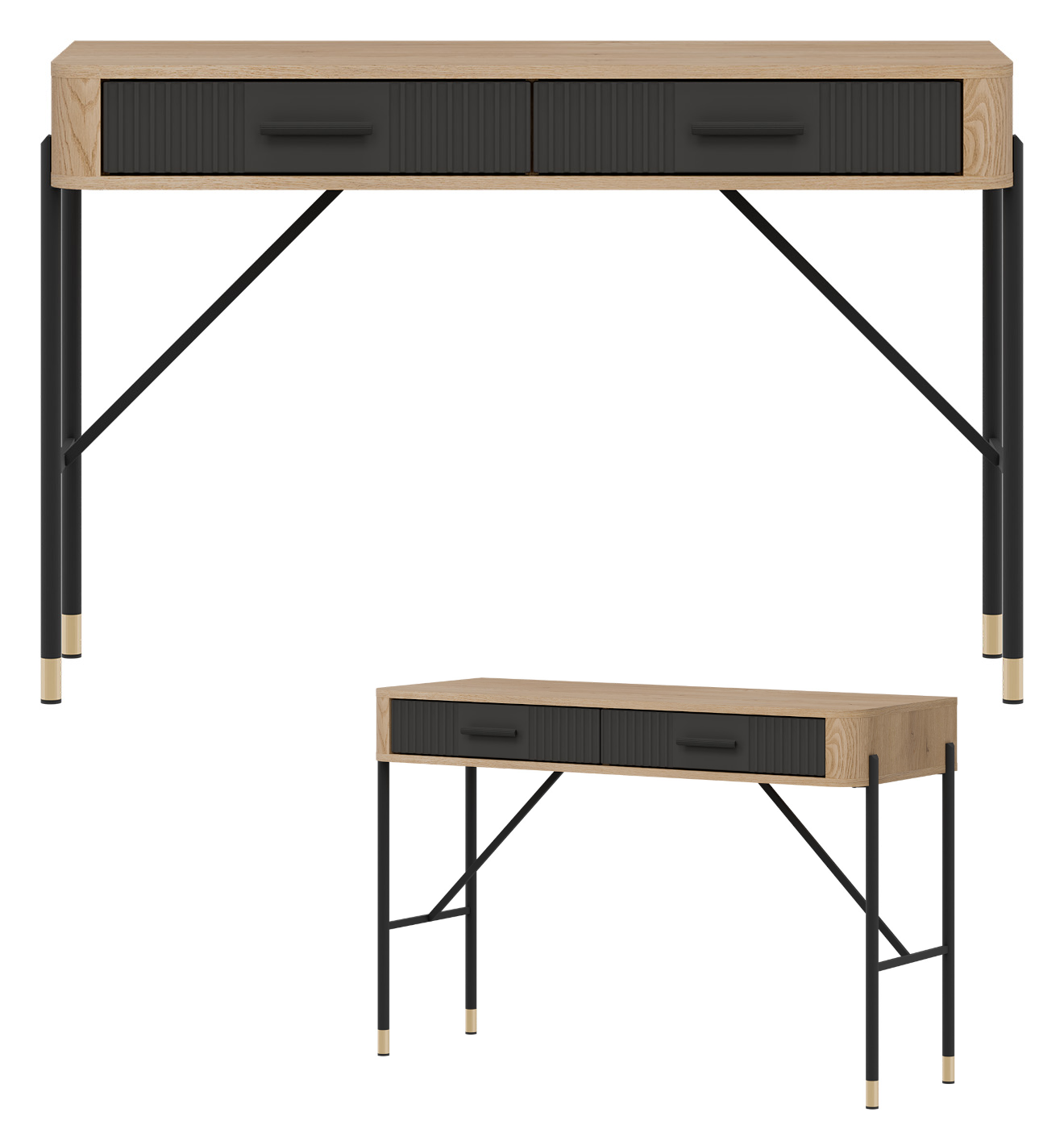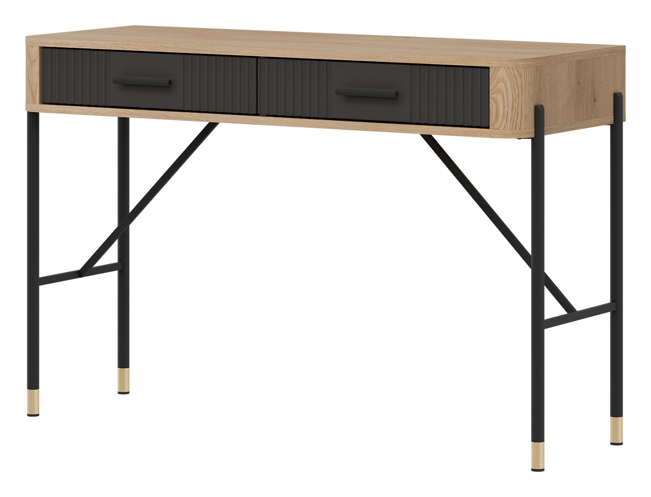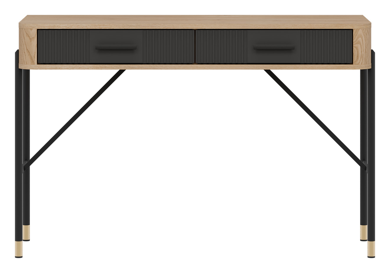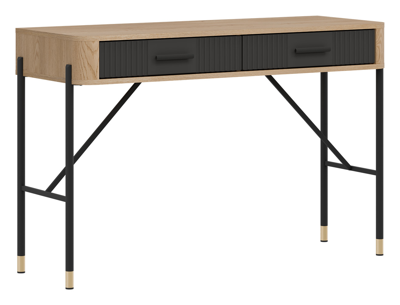 Blat w dekorze ciepłego dębu cremona torro tworzy przyjazną przestrzeń do pracy, a dwie szerokie, łatwo dostępne szuflady w antracytowym kolorze o matowym wykończeniu zapewniają miejsce na niezbędne akcesoria, dokumenty czy przybory biurowe. Smukłe, czarne uchwyty podkreślają nowoczesną linię mebla i dodają mu szyku.