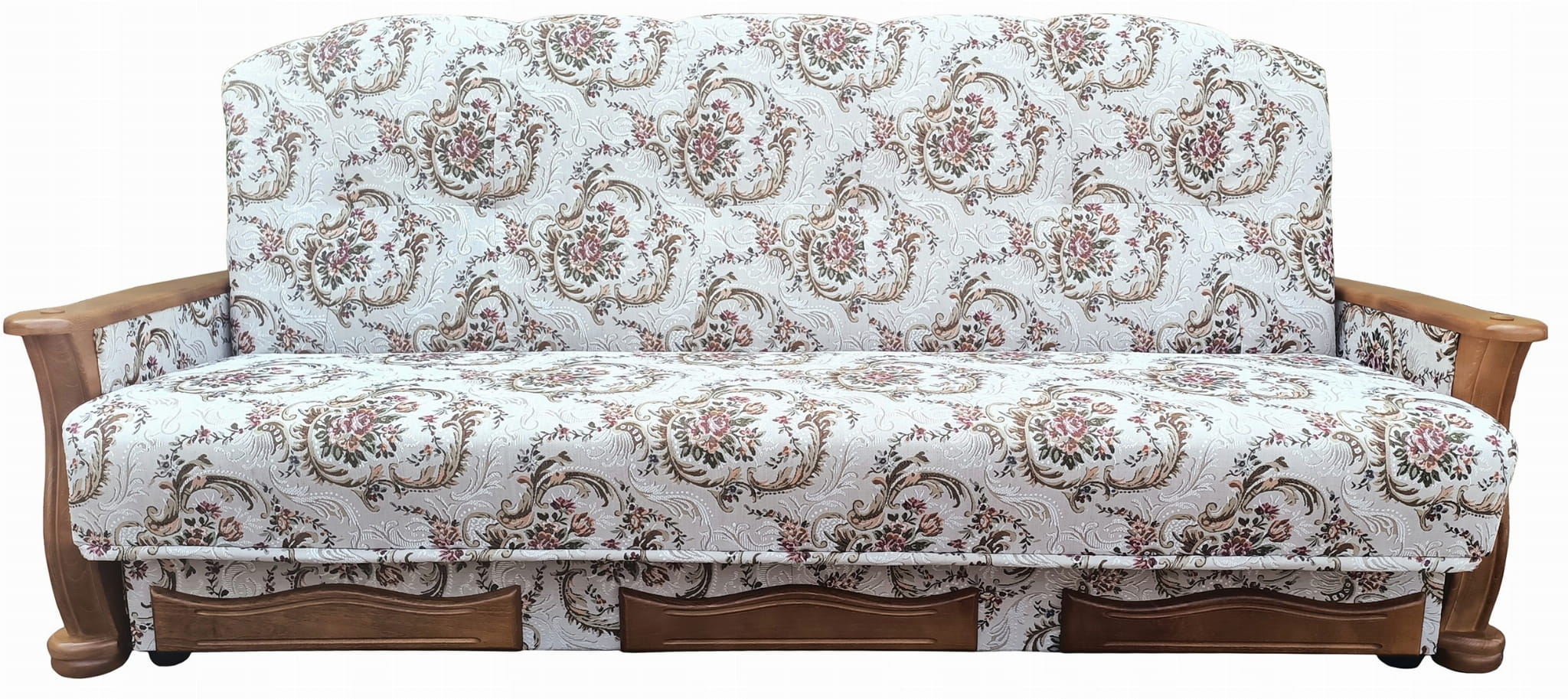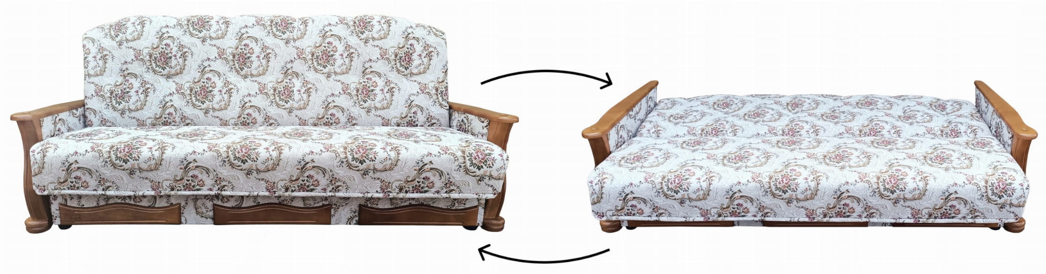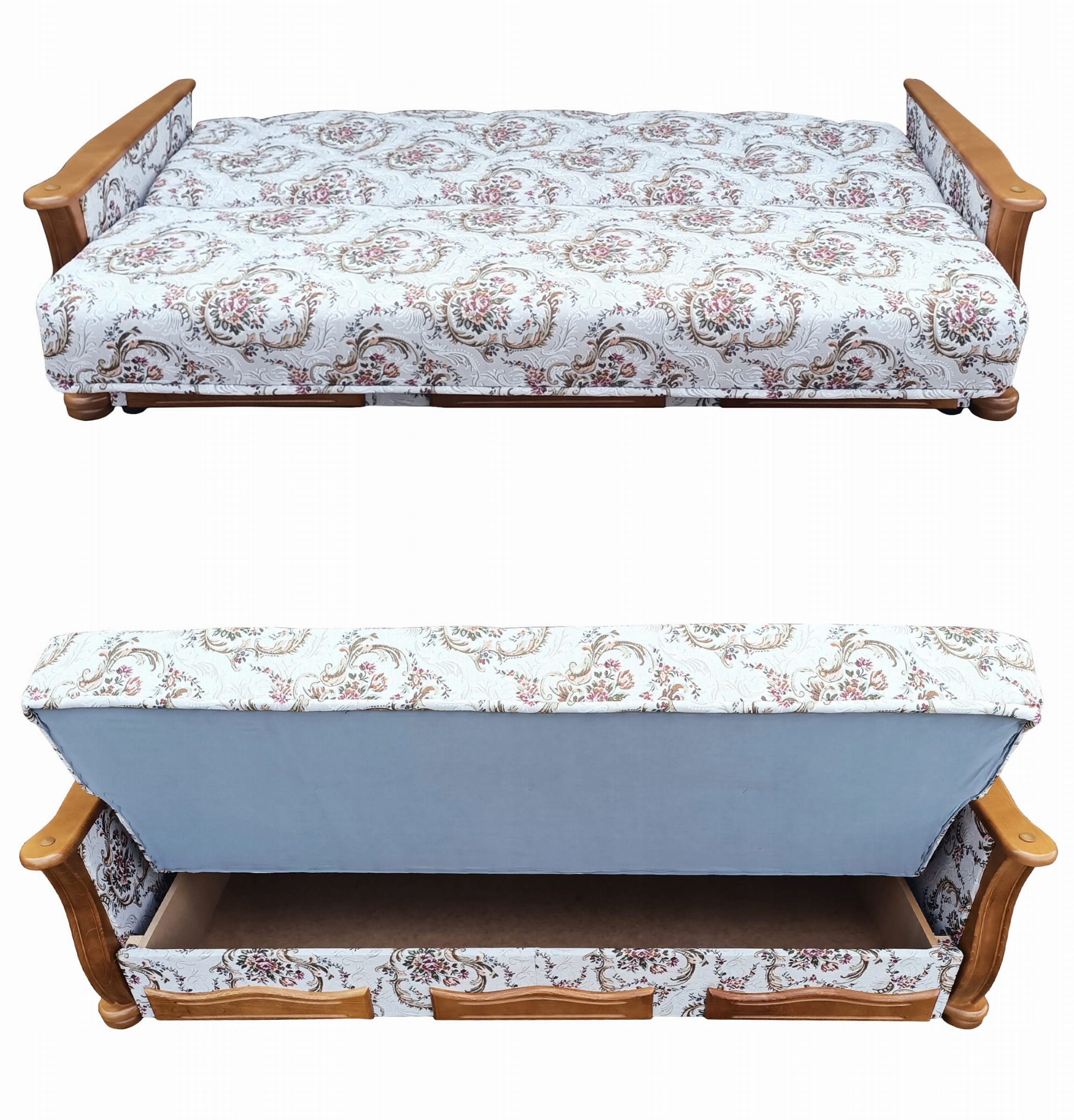Solidny mechanizm rozkładania przytwierdzony do drewnianej ramy za pomocą śrub sprawia, że mebel rozkłada się bezproblemowo, a konstrukcja mebla jest niezwykle wytrzymała i stabilna.