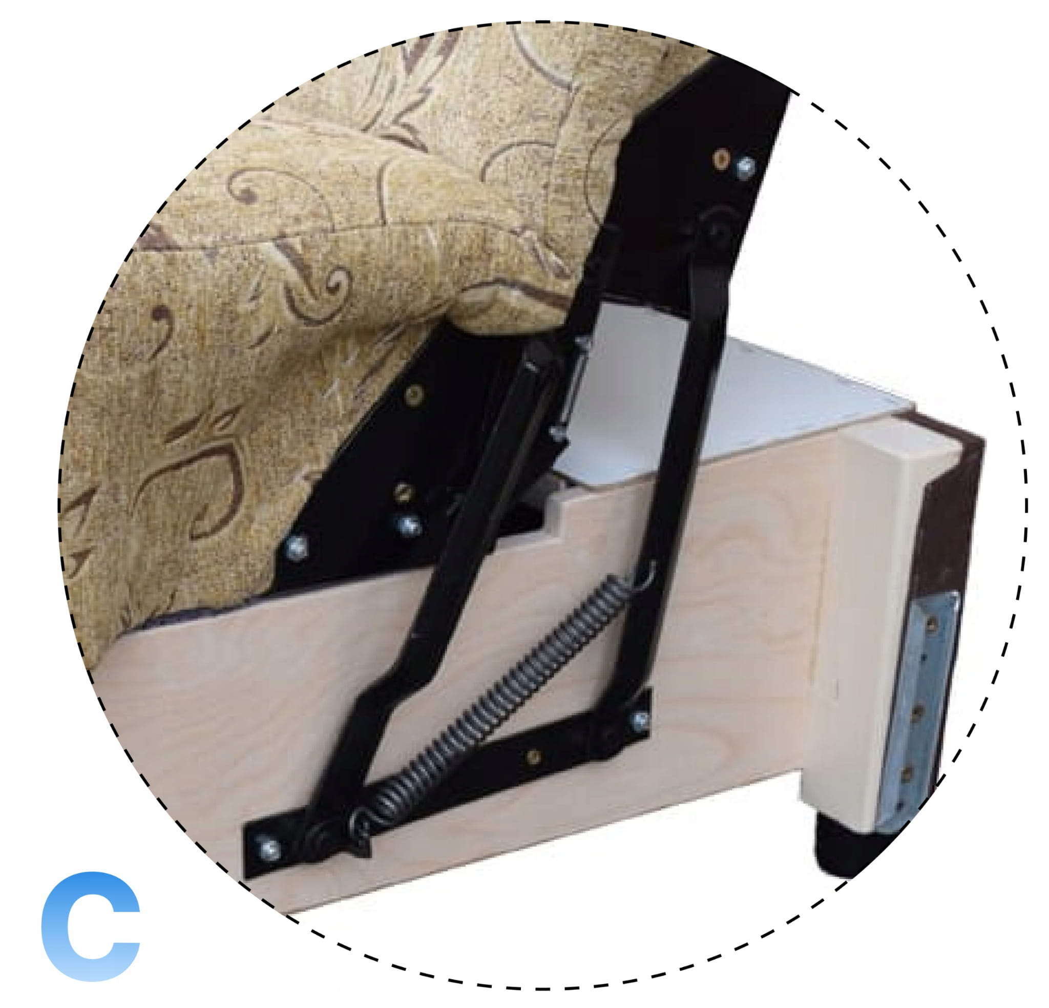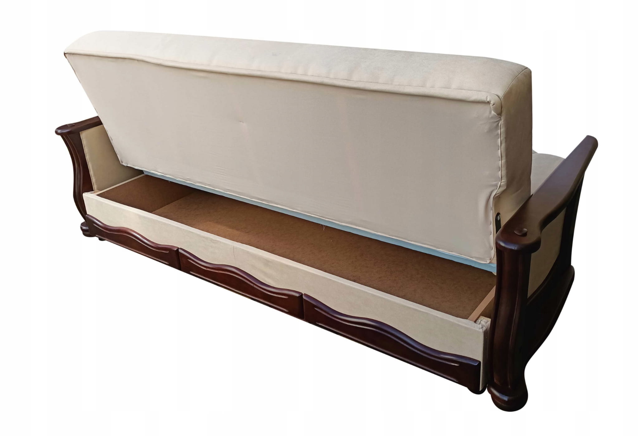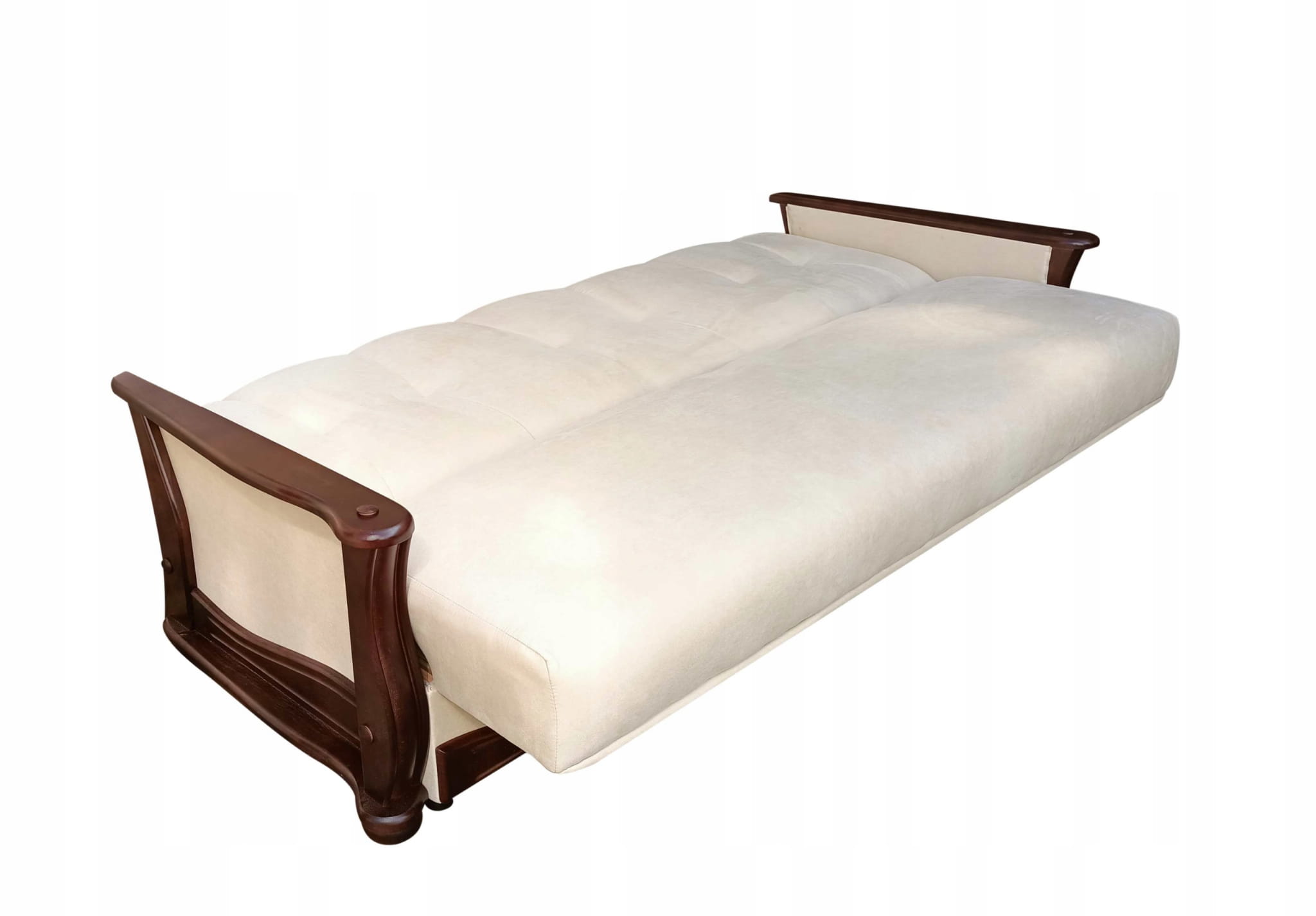 Solidny mechanizm rozkładania przytwierdzony do drewnianej ramy za pomocą śrub sprawia, że mebel rozkłada się bezproblemowo, a konstrukcja mebla jest niezwykle wytrzymała i stabilna.