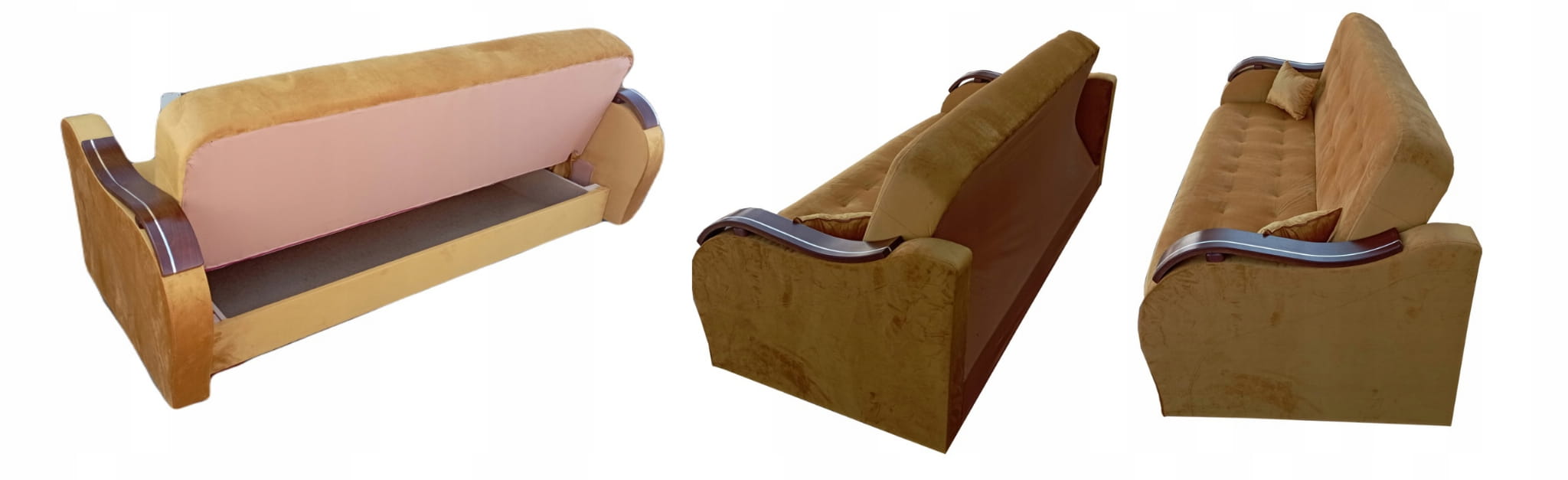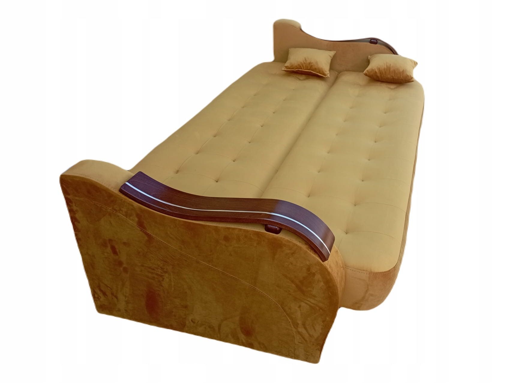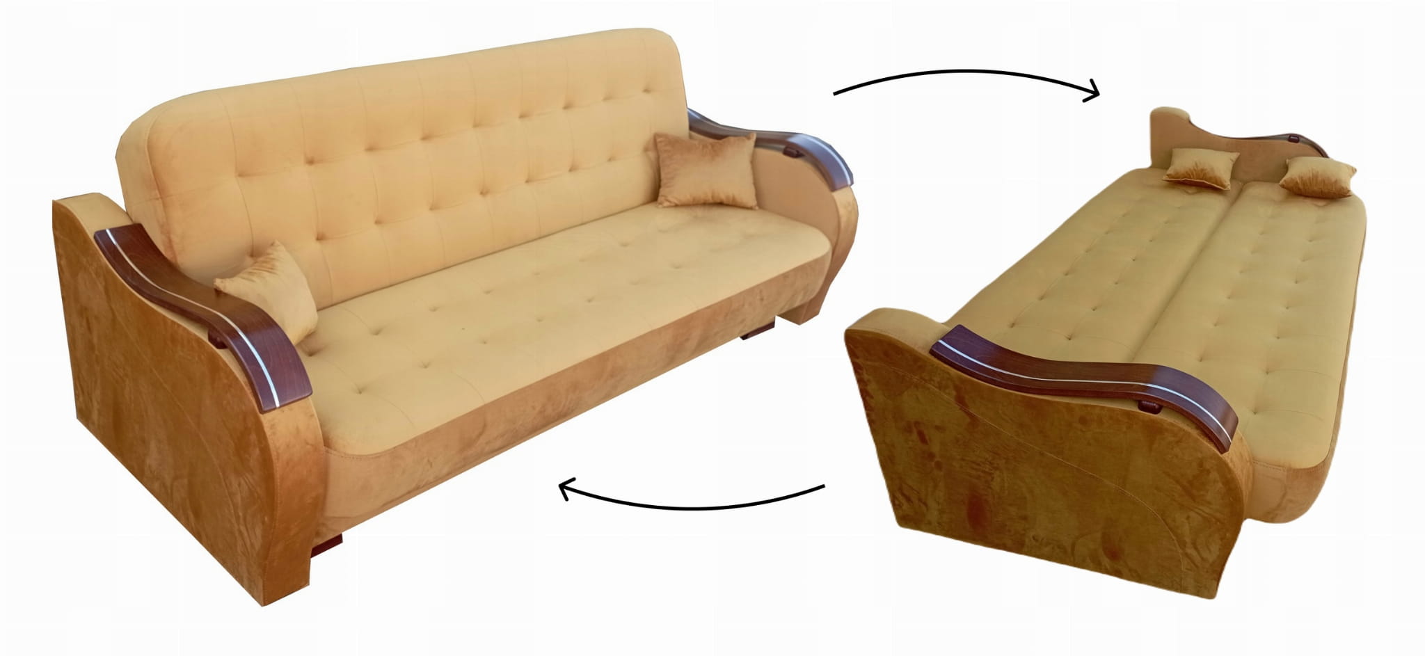 Solidny mechanizm rozkładania przytwierdzony do drewnianej ramy za pomocą śrub sprawia, że mebel rozkłada się bezproblemowo, a konstrukcja mebla jest niezwykle wytrzymała i stabilna.