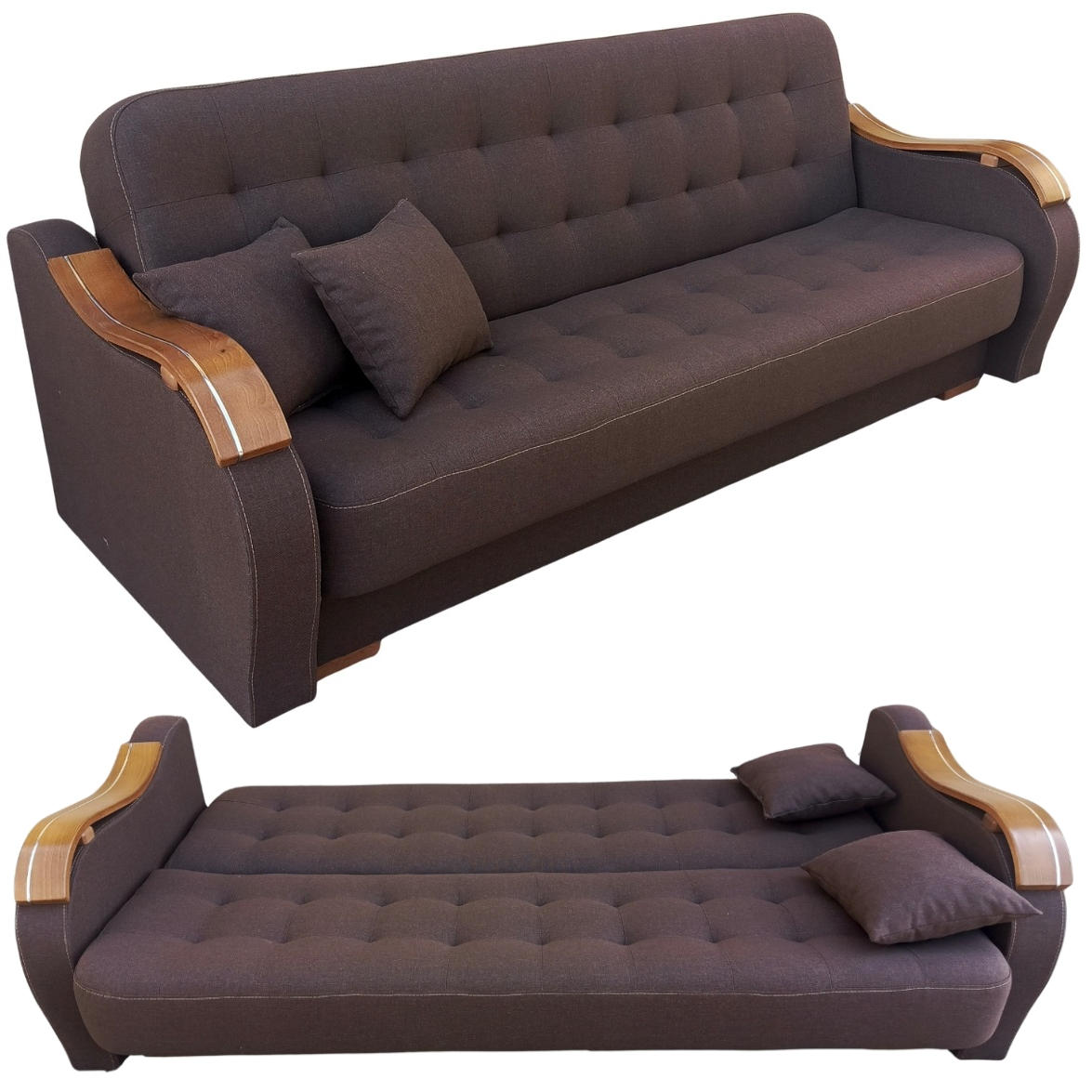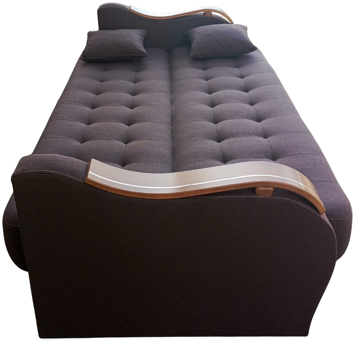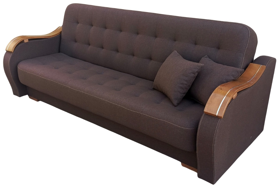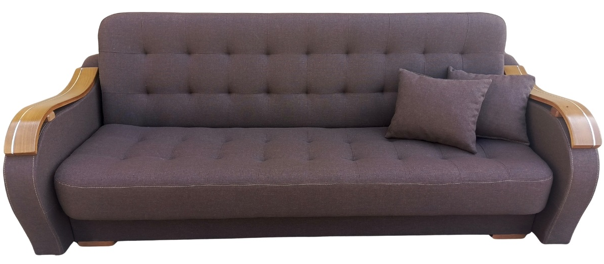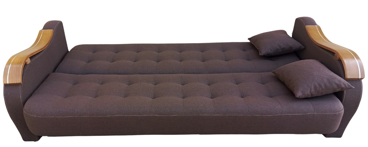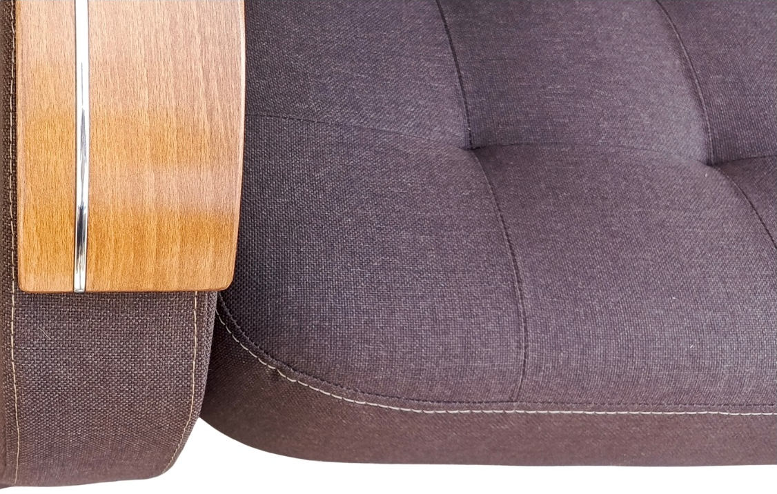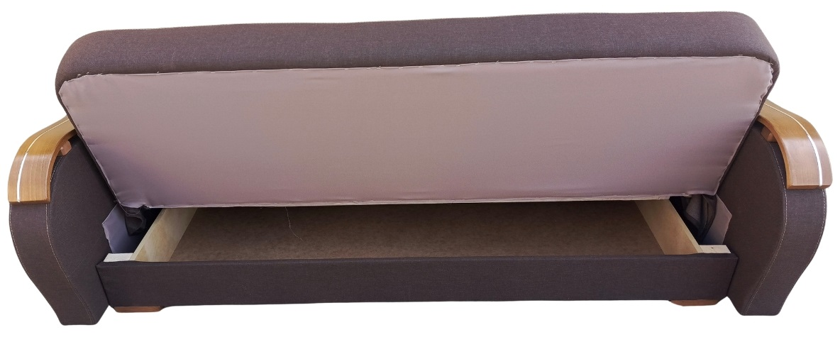 Solidny mechanizm rozkładania przytwierdzony do drewnianej ramy za pomocą śrub sprawia, że mebel rozkłada się bezproblemowo, a konstrukcja mebla jest niezwykle wytrzymała i stabilna.
