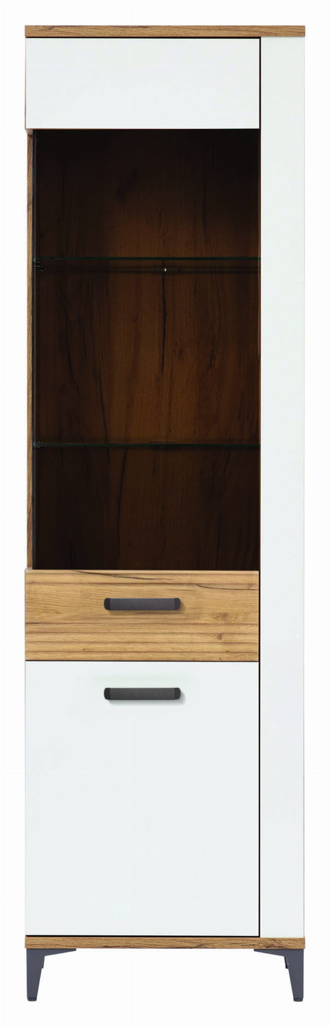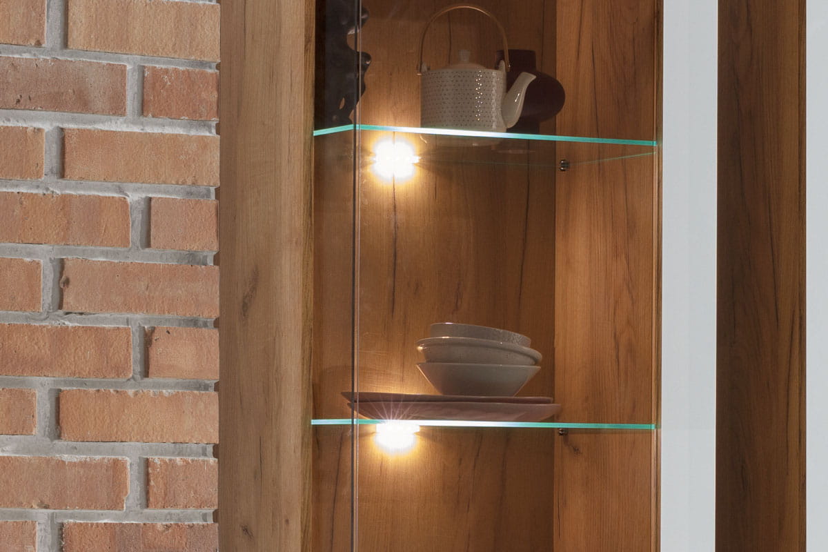 Witryna SNOBI SB8 została zaprojektowana z myślą o stworzeniu stylowej przestrzeni w salonie lub pokoju dziennym. Część przeszklona posłuży do wyeksponowania dekoracyjnych bibelotów, pamiątek rodzinnych czy fotografii w ramkach. Za pełnymi drzwiczkami znajduje się sporo miejsca do przechowywania dowolnych przedmiotów.