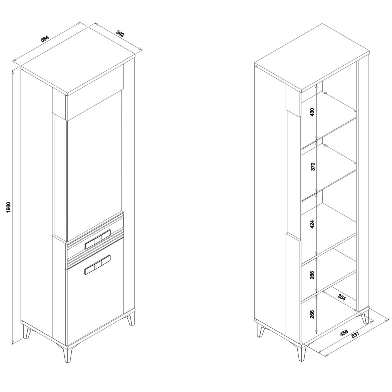 Mebel składa się z dwóch drzwi, za którymi znajduje się pięć wnęk. Za oszkloną przestrzenią znajdują się dwie szklane półki dodające konstrukcji walorów estetycznych.
