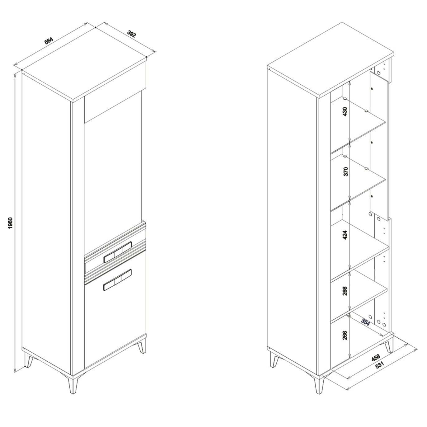 Mebel składa się z dwóch drzwi, za którymi znajduje się pięć wnęk. Za oszkloną przestrzenią znajdują się dwie szklane półki dodające konstrukcji walorów estetycznych.