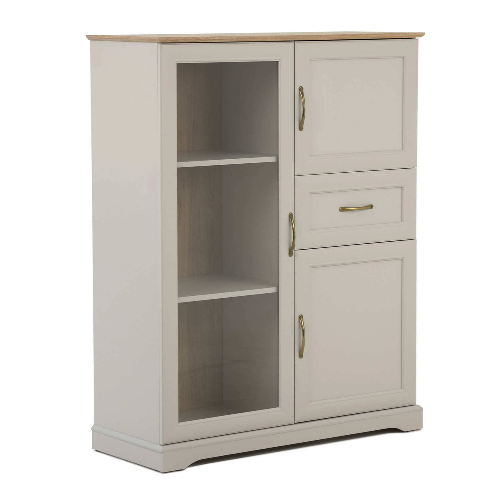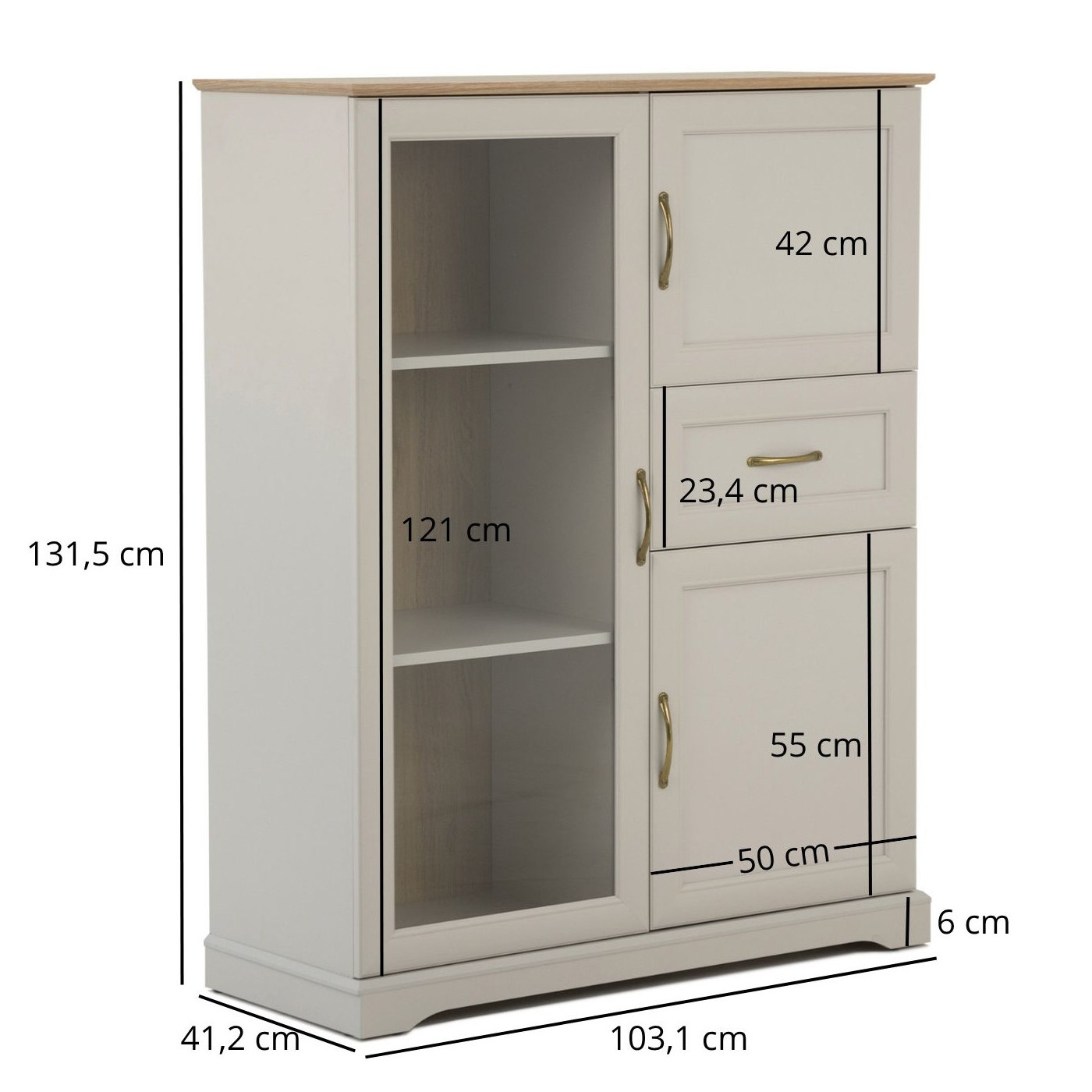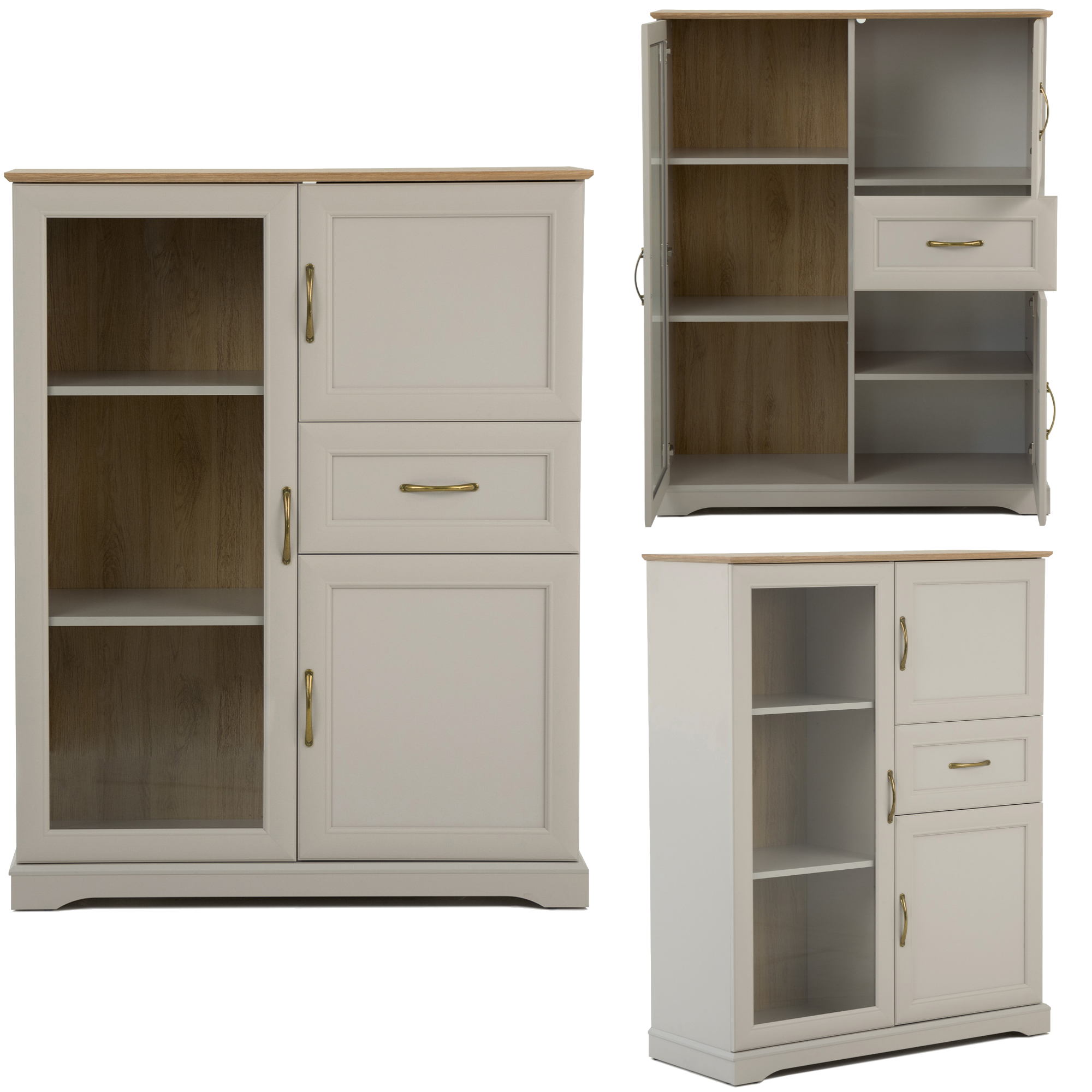Trzydrzwiowy mebel wyposażony jest w szufladę z pełnym wysuwem oraz sześć zamykanych wnęk. Otwierany jest za pomocą wygodnych metalowych uchwytów.