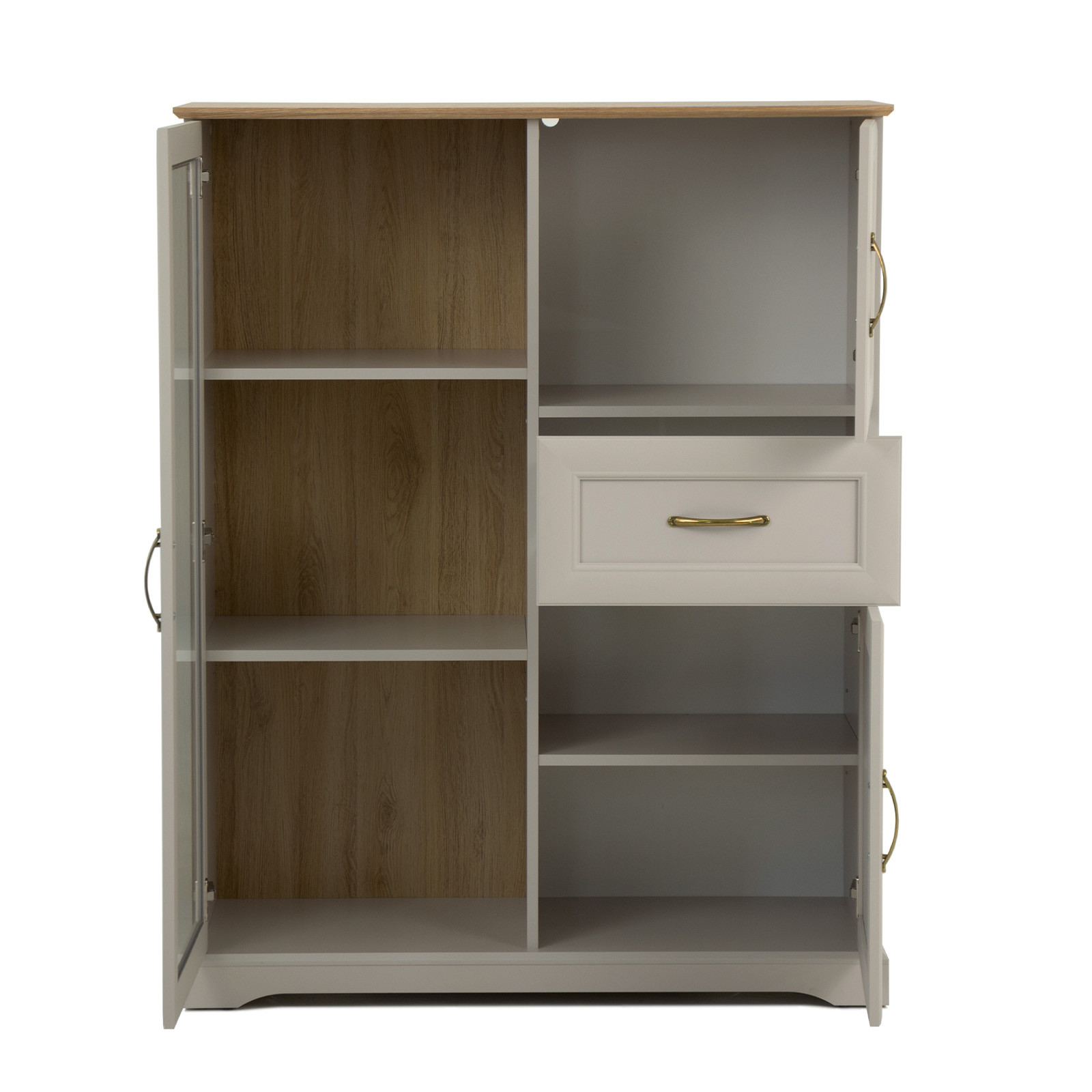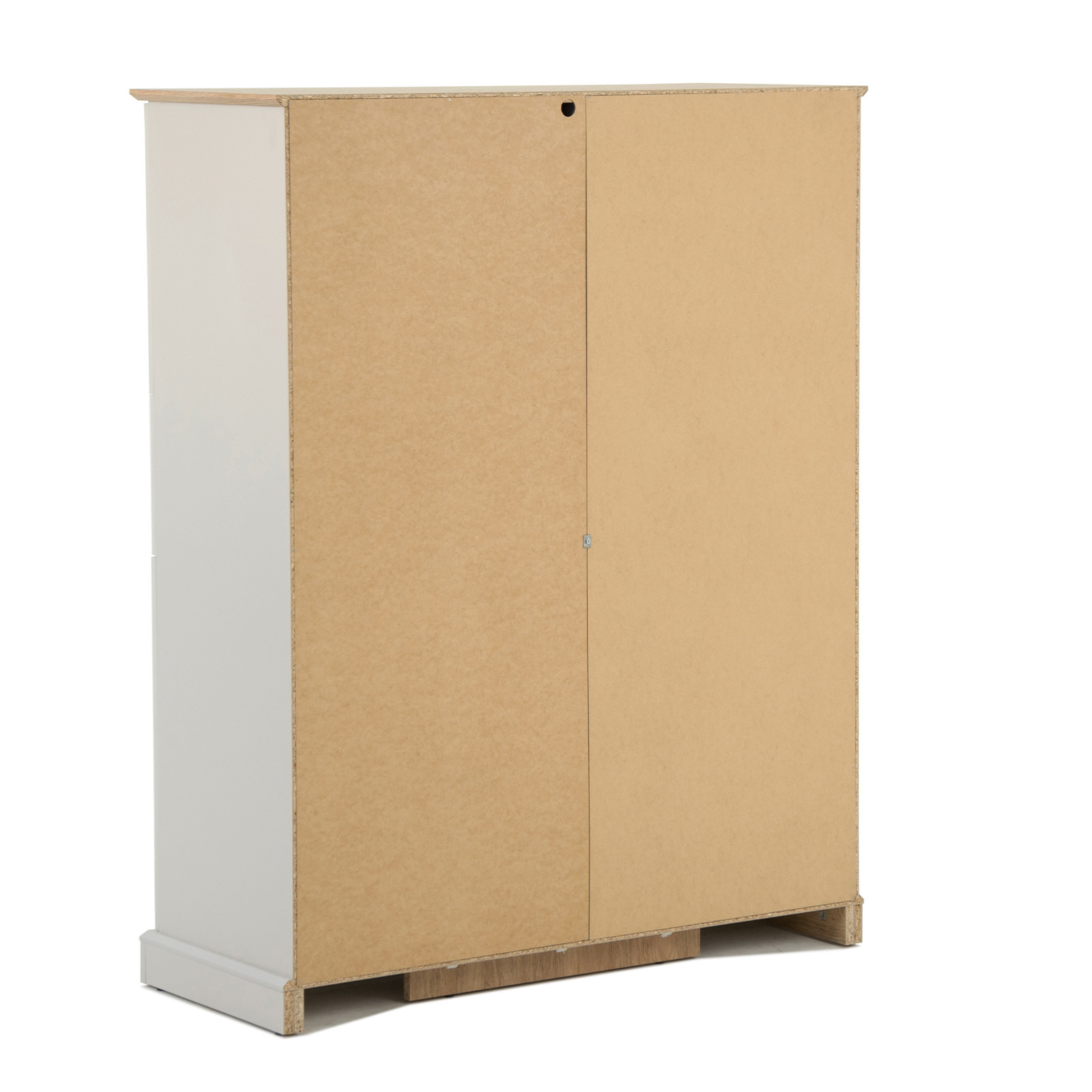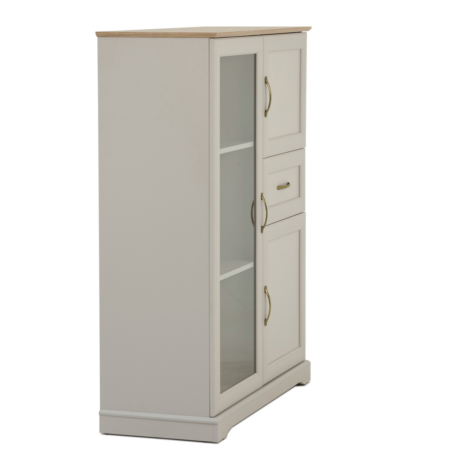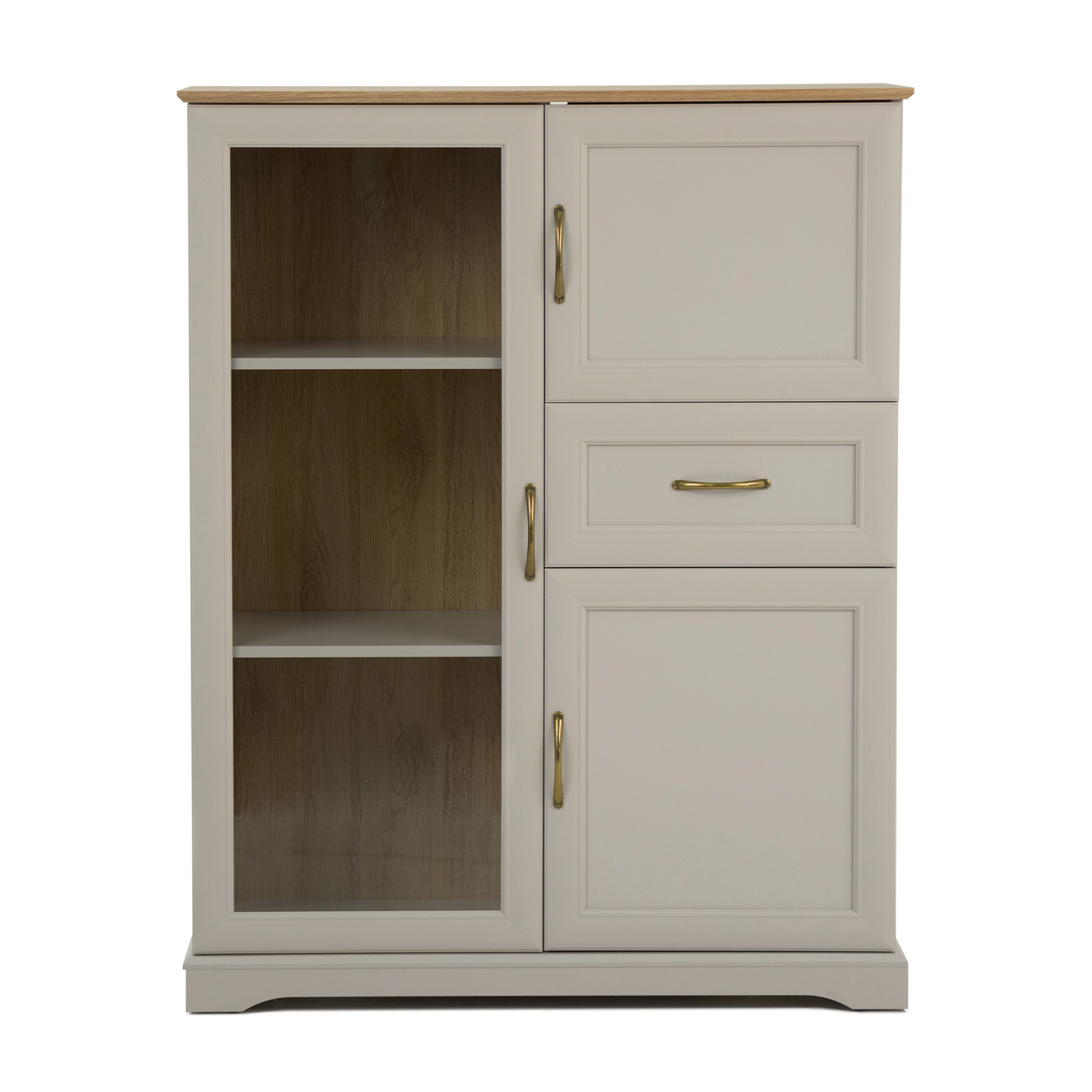 Trzydrzwiowy mebel wyposażony jest w szufladę z pełnym wysuwem oraz sześć zamykanych wnęk. Otwierany jest za pomocą wygodnych metalowych uchwytów.