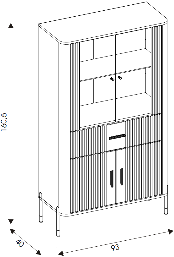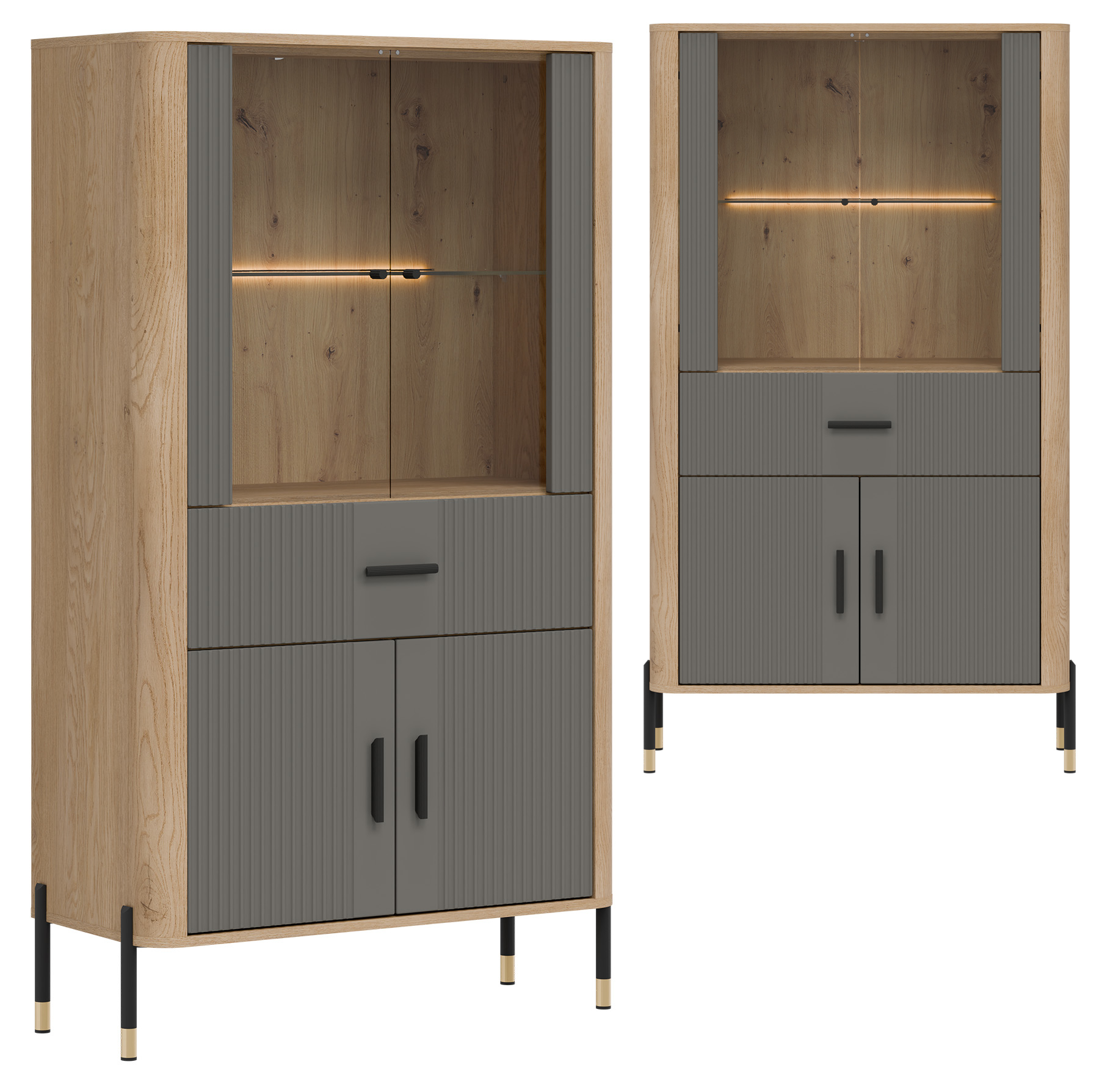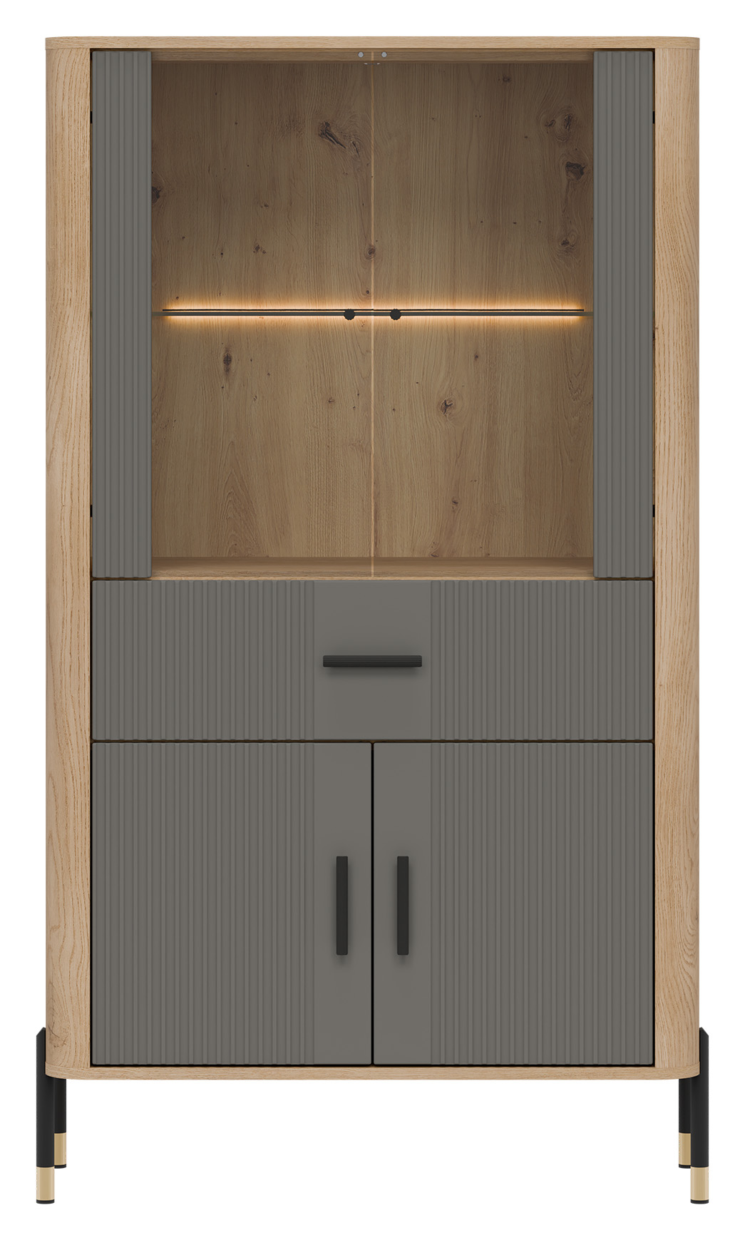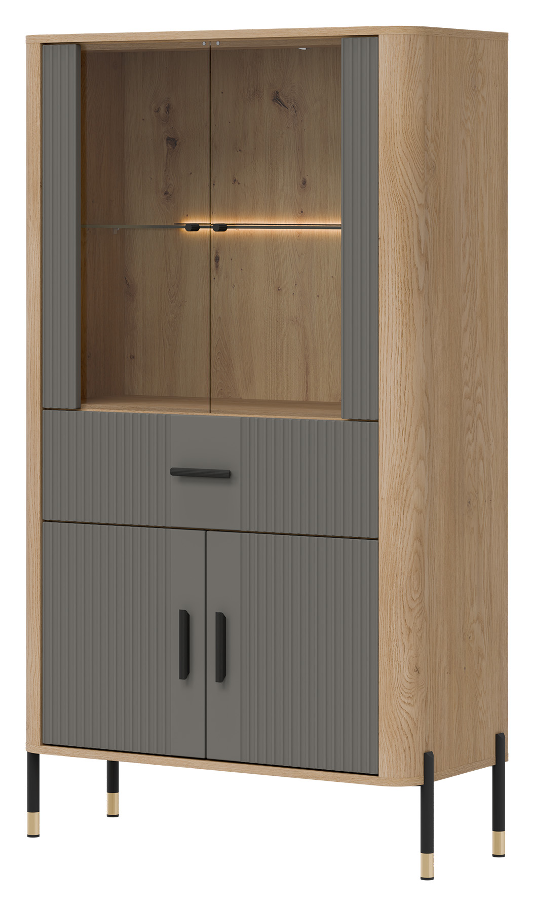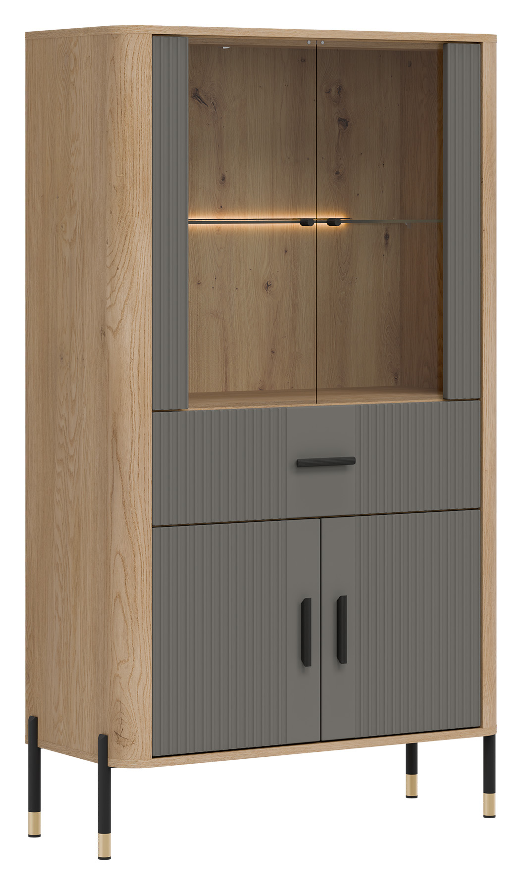 Tło z naturalnym dekorem dębu cremona torro nadaje całości ciepłego, przytulnego charakteru i doskonale kontrastuje z ryflowanymi frontami w szarym kolorze o matowej strukturze. To miejsce, które tworzy klimat – zarówno w salonie, jak i w jadalni. Czarne uchwyty oraz czarno-złote, smukłe metalowe nogi dodają lekkości i ekskluzywnego charakteru, sprawiając, że witryna będzie prawdziwą ozdobą każdego wnętrza.