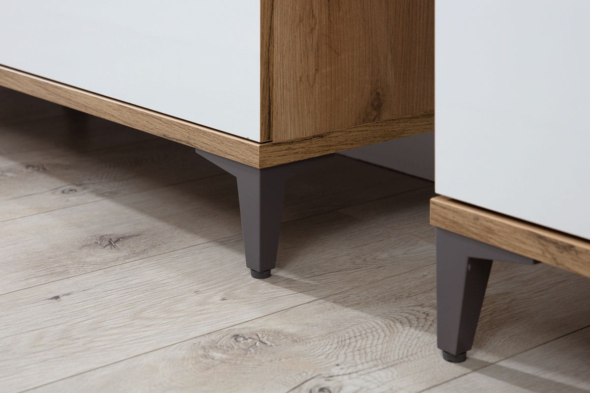 SNOBI SB6 wzbudza zainteresowanie nowoczesnym designem frontów w kolorze połyskującej bieli alpejskiej w połączeniu z ryflowanymi wstawkami wybarwionymi na dąb craft złoty. Mebel ten doskonale wpisuje się w obecne trendy aranżacji wnętrz, a jego stonowana estetyka nadaje każdemu pomieszczeniu lekkości i elegancji.