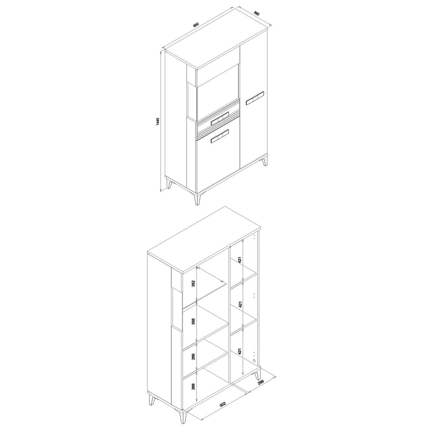 Mebel składa się z trzech drzwi, za którymi znajduje się siedem wnęk. Za oszkloną przestrzenią znajduje się szklana półka dodająca konstrukcji walorów estetycznych.